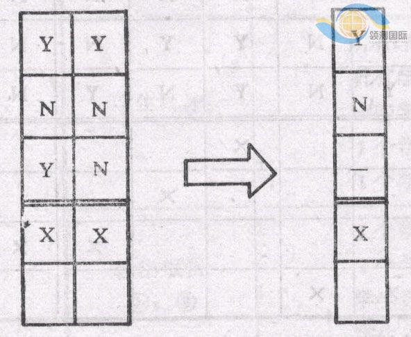 1)如下图左端,两规则动作项一样,条件项类似,在1、2条件项分别取Y、N时,无论条件3取何值,都执行同一操作。即要执行的动作与条件3无关。于是可合并。“-”表示与取值无关。