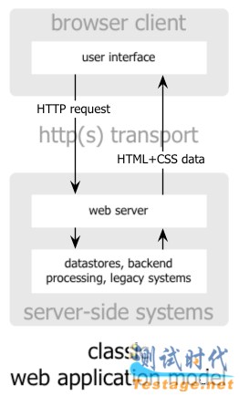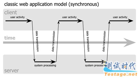 传统的Web应用采用同步交互过程,这种情况下,用户首先向HTTP服务器触发一个行为或请求的呼求。反过来,服务器执行某些任务,再向发出请求的用户返回一个HTML页面。这是一种不连贯的用户体验,服务器在处理请求的时候,用户多数时间处于等待的状态,屏幕内容也是一片空白。如下图: