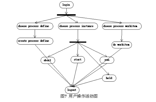 一个过程实例在初始时,均为初始状态(initial state)。根据需要,某个过程实例被创建(create),成为就绪状态(Ready)。随后,用户可以根据需要,选择就绪状态的过程实例进行启动(start),被启动的过程实例的状态就变为运行状态(Running)。处于就绪状态和运行状态的过程实例都可以通过取消操作(abort)转变为结束状态(end state)。处于运行状态的过程实例,通过挂起操作(hold),可以转变为暂时停止的挂起状态(Holded),同时处于挂起状态的过程实例也可以通过运行操作(run)转变为运行状态。挂起状态与结束状态的区别在于挂起状态并不释放所占用的资源,因而是可以恢复的。最后,一个处于运行状态的过程实例如果运行完毕,通过完成操作(finish)转变为结束状态。
