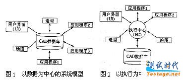 以执行为中心的系统模型如图2所示.这类模型着眼于将不同的应用系统通过统一的执行中心来实现关于数据模型和用户界面的共享和一致.它将共有的计算和执行功能从应用程序中分离出来,放在执行中心,避免了代码冗余;用户与系统的交互与应用程序相分离,便于实现统一风格的用户界面;和数据库的任何数据交换都要通过执行中心进行,有利于数据的严格管理,保证了数据的一致性.这类模型解决了以数据为中心的系统模型的代码冗余及界面风格不统一等问题,但仍存在一些缺陷:执行中心的功能设计复杂,很难确切定义符合所有应用要求的功能集合,而且实现起来也相当困难;执行中心同时与用户界面和所有应用程序保持通讯,又管理着CAD数据库,负担过重,极易形成瓶颈.这类模型既具有数据的开放性,又具有功能的开放性,可扩充性也好,整体上优于以数据为中心的系统模型。