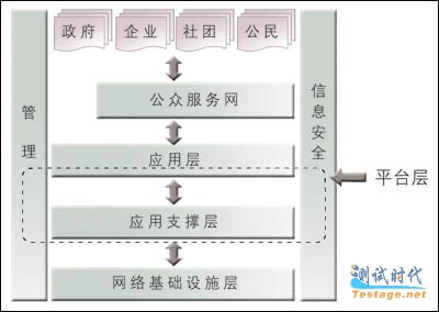 根据“电子政务标准技术参考模型”,电子政务系统总体上可以建模为横向包含多个层次,管理和信息安全纵向贯穿各个层次的技术架构。参考模型的最底层是网络基础设施层,逐渐向上展开的是应用支撑层、应用层、公众服务网及电子政务的服务对象——政府、企业、社团和公民。其基本含义是,应用支撑层支持应用通过公众服务网向电子政务的服务对象服务;管理和信息安全是贯穿各个层次的保障。