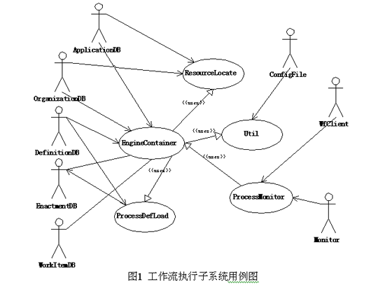 图1表示工作流执行子系统的用例图。活动者包括WfClient(工作流客户端)、Monitor(工作流监控端)、DefinitionDB(工作流定义数据库)、EnactmentDB(工作流运行数据库)、OrganizationDB(组织机构数据库)、ApplicationDB(应用程序数据库)、WorkItemDB(工作项数据库)、ConfigFile(工作流系统配置文件)。这里,WfClient 作为接收用户交互的界面部分,将用户所作的行为,依照固定的规则,将请求送给工作流执行子系统进行处理。Monitor 作为接收系统管理员交互的界面部分,将系统管理员对系统作出的调整,发送给工作流执行子系统进行处理。其余的DefinitionDB 等活动者,负责将工作流执行子系统每一步的操作与状态记录到数据库中,以永久保存。用例包括ResourceLocate ( 资源定位)、EngineContainer ( 引擎容器)、ProcessDefLoad(定义装载)、ProcessMonitor(过程监控)、Util(公用程序)。其中,EngineContainer 通过ResourceLocate 定位所有系统所用到的资源,表EngineContainer 用例使用ResourceLocate 用例,用带有箭头的实线表示。EngineContainer 不直接与用户交互,活动者对工作流的参与都是通过ProcessMonitor 这个工作流执行子系统的入口来进行的。EngineContainer 通过ProcessDefLoad 将现有的工作流定义装入,这样才能运行该工作流,EngineContainer 用例与ResourceLocate 用例之间是使用关系。