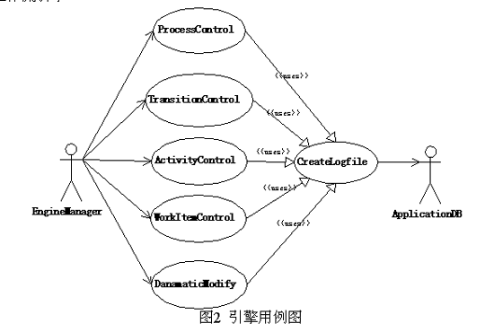 图2表示工作流引擎的用例图。其中的活动者包括EngineManager(引擎管理器)与LogFiles(日志文件)。EngineManager 负责控制工作流中所有元素的状态,是工作流调度的核心。LogFiles 阶段性将固定格式的文字记录为日志,用以保存。这里的用例有ProcessControl(控制过程实例)、TransitionControl(控制转移)、ActivityControl(控制活动)、WorkItemControl(控制工作项)、DanamaticModify(动态修改流程)、CreateLogfile(创建日志文件)。EngineManager 根据一定的条件,通过ProcessControl、TransitionControl、ActivityControl、WorkItemControl 与DanamaticModify,控制工作流各个组成元素的状态,以达到控制工作流的目的。