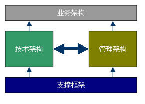 技术架构和管理架构的下一层是支撑框架。支撑框架包括代码、组件、文档,目的是为技术架构和管理架构提供底层的支持。