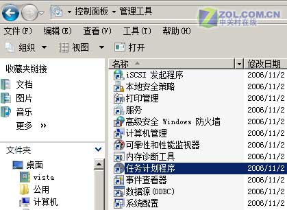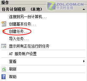 进入控制面板,打开“管理工具”→“任务计划程序”(如图1),在随后打开的对话框中,点击最右侧窗口中的“创建任务”(如图2):