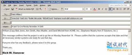 项目管理应保证清晰的通信。电子邮件似乎是首选的通信方法,但它很容易变得数目庞大,让人吃不消,从而使效率低下。一个普遍的良好做法是在需要响应时确定特定的个人。适当的使用致:与抄送:域,就可以避免谁该如何做这样的不明确信息。图A显示的是一个列举特殊责任的电子邮件通信实例。