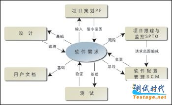 CMM的一个显著的特征是将软件需求作为一个活跃的实体贯穿于整个开发过程之中,实施有效的需求管理事实上渗透在CMM的不同层次(Level)和众多关键过程域之中。软件需求是软件项目成功的关键,软件项目中百分之四十至百分之六十的问题都是在需求分析阶段埋下的“祸根”。美国质量管理协会(ASQC)将“质量”解释为“产品或服务内在特性和外部特性的总和,以此构成其满足给定需求的能力”,Crosby对于质量的定义也是“同需求保持统一”,从这个意义上说,只有满足用户需求的软件产品才谈得上有好的质量,反之,需求管理也正是从质量出发以确定需求。CMM四级的“软件质量管理”过程域中也明确要求,组织、顾客和最终用户的软件质量需求及其优先级可以追踪到分配给软件的系统需求及软件质量目标。因此,CMM的需求管理正是从全面质量管理的主导思想—“以满足顾客需求为导向”出发的,软件开发则应以需求工程作为核心过程(需求过程与其他过程的关系见图1)。