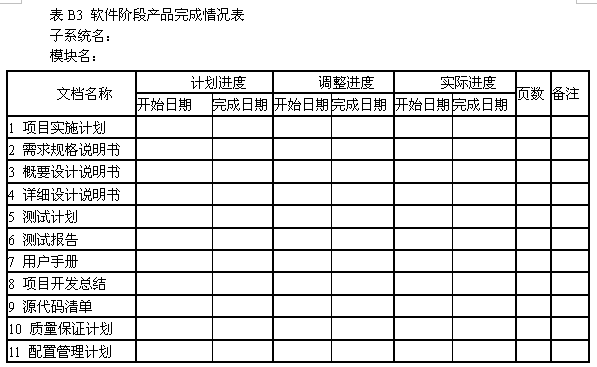 B1 项目进展报表(月报表或季报表)由一个项目进展报表表头(表B1)和另外三个表格(表B2、表B3、表B4)组成。在表B2“软件阶段进度表中”中,要填写各个阶段的开工日期与结束日期。其中计划进度是指在项目实施计划中确定的计划进度,因此可以由管理人员事先填好,而不必由开发人员填写。实际进度是指该项目实际的开工日期与结束日期,它将随着该项目的不断进展填写。其中调整进度是指项目组长发现实际进度与计划进度不符时提出的进度修改建议;但经项目管理人员研究后,可能对此修改建议作某些更改。此外,在相继的若干次报表中,项目组长提出的建议修改日期也可能是不相同的。在此我们规定,最终的调整进度由项目经理来确定。在表B3“软件阶段产品完成情况表”中,要填写各个文档的开始编写日期与完成日期。其中关于对计划进度、调整进度与实际进度的含义的解释与上相同。表B4是关于统计软件开发费用的表格。