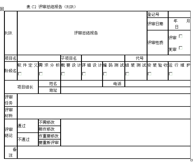 每一次评审工作都应填写评审总结报告(RSR)、评审问题记录(RPL)、评审成员签字表(RMT)与软件问题报告单(SPR)等四张表格。这四张阶段评审报表的具体格式应与附录C中的规定相一致。
