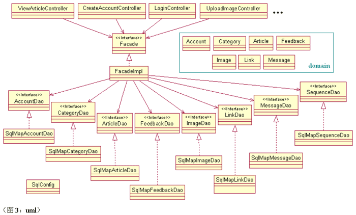 整个系统以Spring为基础,持久层采用DAO模式和iBatis O/R Mapping,封装所有数据库操作;中间层是由Spring管理的普通的JavaBean,采用Fa?ade模式;表示层使用Spring提供的MVC框架。由于Spring对其他框架的良好集成,我们采用Velocity作为View。由于Velocity不能调用Java代码,从而强制使用MVC模式而不是在View中嵌入逻辑代码。