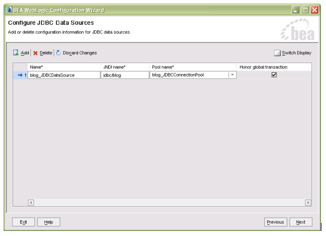 在WebLogic中新建一个Configuration,命名为blog,添加一个数据源,命名为jdbc/blog:
