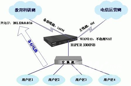 为了解决上述问题,我们这里以HiPER 3300NB智能高速宽带路由器为例子,说明在学校中的应用。它具有双WAN口,可以将它的一个出口连接到教育科研网,另外一个出口连接到当地运营商,学校内部网接到局域网口。下面以一个例子来说明我们的解决方案。