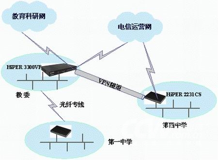 如图,在教委的出口配置一台HiPER 3300VF VPN安全网关,HiPER 3300VF的WAN口连接电信运营商的线路,地址是218.1.1.10/28,LAN口连接到教委的内部网络,WAN2/DMZ口连接到教育科研网的出口;在第四中学的出口处,根据网络的情况,可以选择使用HiPER 2231CS或HiPER 3110、HiPER 3100VF等设备,并在HiPER中建立一条连接到教委的HiPER 3300VF的VPN隧道。