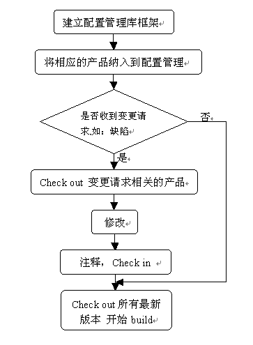 问题一:该案中Team的沟通平台建设有问题,没有建立组间协调的基本准则,和监督手段,这样会出现没有完成的工作可以提交甚至是移交给下一个环节。 问题二:该案中没有说是否采用了配置管理工具,但很显然配置管理规范是没有做的。 问题三:该案中的Team Leader 没有起到疏通流程,接收反馈,改进过程的作用。 问题四:该案中尚没有建立很权威的软件质量标准。 高质量的工作=过程+管理+技术 首先,过程。应该说现在很多软件公司的工作流程都很不完善,需要过程改进。而且更多的时候需求管理和配置管理是过程改进的关键和瓶颈所在。需求管理和配置管理不善就会直接的给开发和测试工作带来负面影响,尤其给测试和开发人员的沟通增加了障碍。导致效率不高,就如本案中提到的问题点。那么配置管理的过程是什么呢?如下图 当项目组有越多的成员的时候,制定一个规范的流程就显得越发的重要。 第二,管理。所谓“无规矩,无以成方圆”,在做好管理之前制定一套合理的管理规范是必须的,流程有了,但是管理不善也是会功亏一篑的。配置管理,可以说是时间、人、工作内容的全面管理。 1.时间,时间管理主要是及时的向配置管理库中提交更新的内容,从而避免在Build的新版本的时候有遗漏,而导致本案中提到的,测试人员在回归的时候发现提交的缺陷根本没有改的状况,重新再Build一个版本,那自然是人、时、力的极大的浪费。 2.人,作为所有数据的处理和操作主体,是管理的关键,一个误操作就可能使很多人的工作成果付之流水,所以付给不同角色的人不同的权限是很关键的,曾经有一个项目经理给所有的人员只能提交,不能删除的权限,还谓之约“糖公鸡”策略。(意思是不但不拔毛,还粘毛)这不是不信任谁,而是在极大程度上保护大家的劳动成果。 3.工作内容,工作内容可以说是工作质量和工作的主体了,同时也是大家交流的主要对象。对于工作内容的管理主要注意下面几个方面。 * 注释,很多程序员再写代码的时候,不做注释,一个程序员一种风格,这就给读代码,尤其是交叉检查代码带来了困难,人的记忆能力总是有限的,老人家常说“好记性,不如烂笔头”相信时间久了,代码的易读程度就会受到影响。所以代码要求注释。 * 更新说明,在做更新的时候要写说明,我们都知道,变动的代码是极有可能跟很多其他开发人员写的代码有关联的,那么代码的变更势必需要相关联的代码也跟着变更,如果没有,那当然就会出现,提交的缺陷修改完成了,又引入了新的问题的状况。关联复杂的情况下定位问题是很不容易的。由此可见更新的说明对于沟通是多么的重要,当然它也是有帮助记忆的作用的。 * 代码状态,这个是内容管理很重要的一部分,这个状态既能标示一个开发人员的工作里程碑,也能给Build新版本提供一个依据。从而保证Build的每一个新版本是开发人员确认过了的有效的一个版本。 第三,技术。开发工程师和测试工程师的技术水平也是决定版本质量的关键,甚至决定性的因素,开发人员不比说了,资深开发人员和刚毕业的开发人员会出现的Bug都很大区别。但经验都是积累出来的。测试人员的水平是很需要提高的,一个同行把测试分为验证和确认两种,(CMMI中也有这样两个过程域)。验证,主要来做数据结构,系统架构,逻辑结构的严谨的验证,从而保证算法、逻辑的严密和准确。确认,主要来看这个系统是否满足了客户的业务需求。我想着不无道理。这样能更深层次,或者更有依据的来保证软件的质量,我们直接就做确认了,确认正确的结果可能是一个假象,就像2+2=4,但公式如果写成2*2=4两个的结果是一样的,但是实现确实完全不一样的。不论是开发人员还是测试人员,在软件质量保证上的目标是一致的,技术要求也是一致的。 技术指标的制定,这个笔者也不能给出什么建议,只知道没有最好,只有更好,我们需要不断的提高技术水平。技术提高,不耻下问很重要,一个技术难题很可能其他同事已经解决了,而你不知道,就还需要钻研很久。一个相同的功能,很可能多少个开发人员就有多少种实现,何不大家沟通一下,选个最好的呢?配置管理也是,如果你有更好的解决办法,也别忘了跟我们共享一下。 说的可能有点远,但在任何时候做正确的事情,都比坚持错的效果要好。配置管理,从现在开始吧!