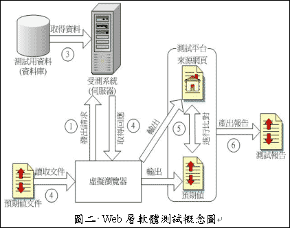 在Web层内软件测试的概念与流程,如图二所示,其中键头旁的数字符号代表着整个测试流程的执行步骤。首先先准备好受测数据与受测系统之后,借着虚拟浏览器来发出request,向受测系统取得包裹着HTML code的response。然后再利用测试平台来协助我们进行受测数据与预期值的比对工作。当比对后所回报的结果都是正确无误时,代表着受测系统的功能可以正常运作了。图中的测试平台与虚拟浏览器在测试中扮演着关键的角色。