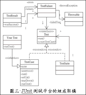 JUnit平台里还有另一个核心类别是TestSuite,而每一个TestSuite代表着一个复合的对象。一个TestSuite可以由数个TestCase或是数个TestSuite组成,因此可以根据测试的需求,拼凑出多个的TestSuite。整个JUnit测试平台的组成架构,如图三所示。在了解了JUnit平台的架构之后,我们便可以运用JUnit平台来发展受测系统的整合测试与功能测试。