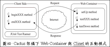 Cactus基本上也是延伸JUnit平台而发展出来的,因此它除了原有基本的method之外,还提供了可以用来模拟浏览器的内部行为的beingxxx( )和endxxx( )的method。这两个method来 这些method的执行顺序和与Web Container互动的行为模式,如图四所示。