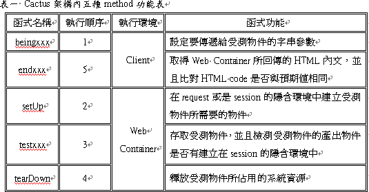 我们利用beginxxx( )来设定要传递给受测对象的字符串参数。执行完beginxxx( )后,会发出request将参数名称与参数值传递到Web Container。TestCase会执行setUp( ),将受测对象所需要的对象环境建立起来,接着在testxxx( )执行存取受测对象的动作。当存取受测对象的动作执行完后,便可以检验受测对象可能存放在session的产出物。然后在Web Container会执行释放资源的动作,然后将response回传到Client端。最后在Client端执行endxxx( )来进行比对HTML code是否和预期值相同,执行完endxxx()时也代表一个整合测试的结束。将这五个method所执行的功能汇整如表一所示。