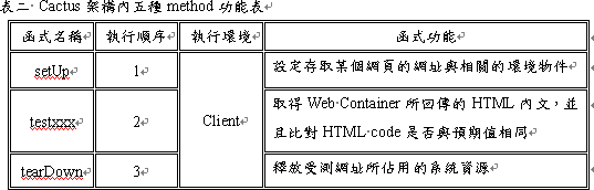 当我们在setup( )设定好受测的网址与相关的环境后,setUp( )会执行向受测网址进行存取的动作。当存取动作完成时,会将response回传至Client端。此时可以在testxxx( )做HTML code和预期值比对的工作。最后在Client端执行释放资源的动作,执行完tearDown()时也代表一个功能测试的完成。将这三个method所执行的功能汇整如表二所示。