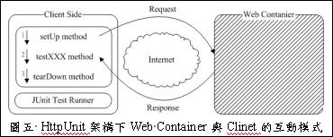 HttpUnit解决了软件开发人员以上的困扰。HttpUnit是一种黑箱作业形式的测试工具,因此我们只要专注如何在JUnit平台上撰写模拟浏览器行为的测试码即可。HttpUnit内的method执行顺序和与Web Container互动的行为模式,如图五所示,箭头符号旁所标示的数字,代表着这些method的执行顺序。