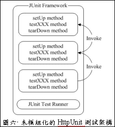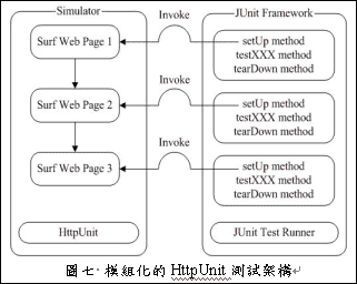 于是利用了HttpUnit本身也可以写成独立运作的程序代码的特性,写成一个浏览网站步骤的仿真器。然后利用JUnit的setUp( )来存取受测网站的浏览状态,便可以在testxxx( )取得正确的网页状态来进行比对的工作,经过模块化后的HttpUnit测试架构如图七所示。