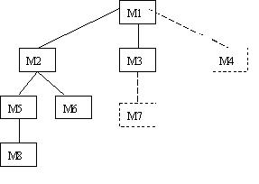 从第二步开始,循环执行上述步骤,直至整个程序结构构造完毕。下图中,实线表示已部分完成的结构,若采用深度优先策略,下一步将用模块M7替换桩模块S7,当然M7本身可能又带有桩模块,随后将被对应的实际模块一一替代。