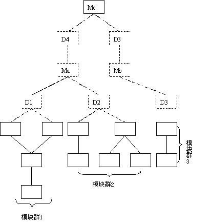 下图说明了上述过程。首先“原子”模块被分为三个模块群,每个模块群引入一个驱动模块进行测试。因模块群1、模块群2中的模块均隶属于模块Ma,因此在驱动模块D1、D2去掉后,模块群1与模块群2直接与Ma接口,这时可对MaD3被去掉后,M3与模块群3直接接口,可对Mb进行集成测试,最后Ma、Mb和 Mc全部集成在一起进行测试。