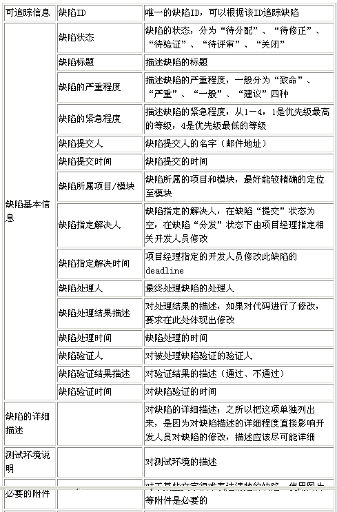 缺陷的描述项中用淡紫色描述的是缺陷在处理阶段填写的内容;用淡青色描述的是缺陷在验证阶段填写的内容。除上述描述项外,从统计的角度出发,还可以添加上“缺陷引入阶段”、“缺陷修正工作量”等项目。
