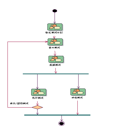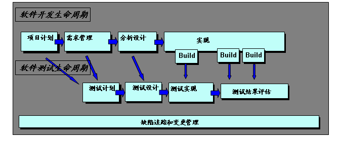 首先,软件的整个测试生命周期是与软件的开发生命周期基本平齐的过程,如图三所示,即当需求分析基本明确后我们就应该基于需求分析的结果和整个项目计划来进行软件的测试计划;伴随着分析设计过程同时应该完成测试用例的设计;当软件的第一个发布出来后,测试人员要马上基于它进行测试脚本的实现,并基于测试计划中的测试目的执行测试用例,对测试结果进行评估报告。这样,我们可以通过各种测试指标实时监控项目质量状况,提高对整个项目的控制和管理能力。