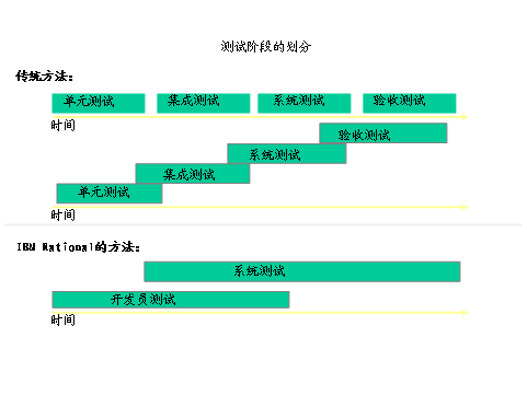 最后,IBM Rational的尽早测试成功经验还体现在它扩展了传统软件测试阶段从单元测试、集成测试到系统测试、验收测试的划分,将整个软件的测试按阶段划分成开发员测试和系统测试两个阶段,如图四所示,它把软件的测试责无旁贷地扩展到整个开发人员的工作过程。通过提前测试发生的时间来尽早地提高软件质量、降低软件测试成本。