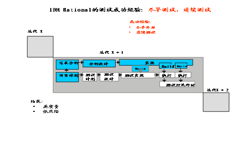 测试成功经验连续测试是从迭代式软件开发模式得来。在迭代化的方法中,我们将整个项目的开发目标划分成为一些更易于完成和达到的阶段性小目标,这些小目标都有一个定义明确的阶段性评估标准。迭代就是为了完成一定的阶段性目标而从事的一系列开发活动,在每个迭代开始前都要根据项目当前的状态和所要达到的阶段性目标制定迭代计划,而且每个迭代中都包括需求、设计、编码、集成、测试等一系列的开发活动,都会增量式集成一些新的系统功能。通过每次迭代,我们都产生一个可运行的系统,通过对于这个可运行系统的测试来评估该次迭代有没有达到预定的迭代目标,并以此为依据来制定下一次迭代的目标。由此可见,在迭代式软件开发的每个迭代周期我们都会进行软件测试活动,整个软件测试的完成是通过每个迭代周期不断增量测试和回归测试实现的。