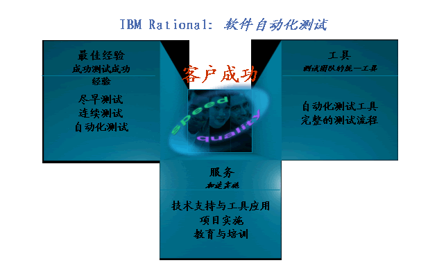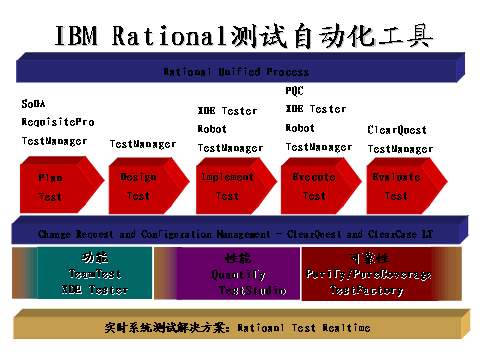 为了使各种软件测试团队更好地进行测试,IBM Rational在提供了测试成功经验之外,还为我们提供了一整套的软件测试流程和自动化测试工具,使软件测试团队能够从容不迫地完成整个测试任务。