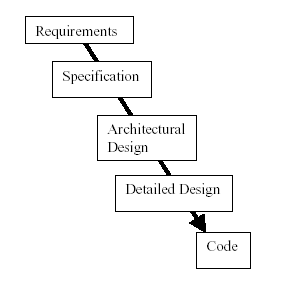 这是古老的瀑布模型。作为开发模型,它有很多问题,不过这里不作讨论。尽管它的各种状态是我们接着要讨论的大家最熟悉的V模型的基础。我的批评意见同时也针对其它的装饰在一些更好的开发模型之上的测试模型,例如螺旋模型[Boehm88]。