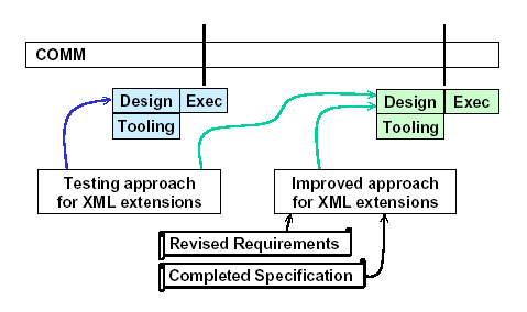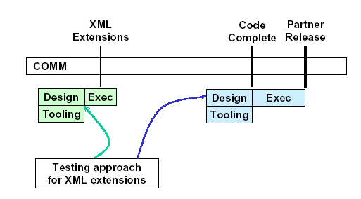 现在我们可以提出一些有趣的关于测试计划的问题了。最简单的可以做的事情是,在移交的时候立即执行XML支持的完整测试。(“完整”的含义是,为此设计尽可能多的测试)但也许一些XML特性并不是XARG小组所需要的,因此可以把它们放在合作伙伴版本封版(下图中的“Partner Release”)的测试中去。这意味着可以把一些XML相关测试放到稍后的移交过程中去。或者基于其它理由,例如在近阶段有其它的测试任务要执行。而XARG小组则要因XML中的bug修复而延迟一小段时间。