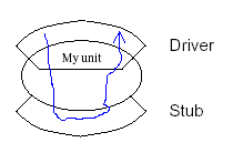 那么,如何针对单元进行测试呢?我们会查看在详细设计中对接口的定义,或者查看源代码,或者同时对两者进行查看,找出符合某些测试设计中的有关准则的输入数据来进行输入,然后检查结果,看其是否正确。由于各单元一般来说不能独立地运行,所以我们不得不另外设计桩模块(Stub)和驱动模块(Driver),如下图所示。