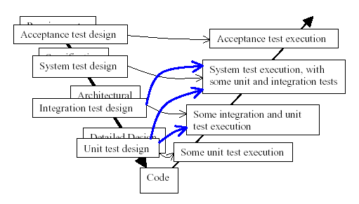 V模型没有去考虑这些问题,当单元开发完成后就执行单元测试,而当自系统被集中在一起后就执行集成测试,仅此而已。令我奇怪和沮丧的是,人们从不去做一些权衡,他们已经受制于他们的模型。