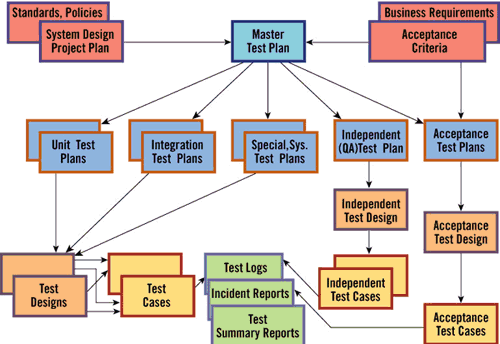 主测试计划组合了一整套的测试计划,该计划主要考虑的是,系统作为一个整体时必须正常运作。通常,在一个分计划(详细计划)中应描述相应的单元测试、集成测试、特殊测试及系统测试。其中,特殊测试是一种综合性的测试,而并不是被应用所驱动的那种测试,可以是诸如压力测试、安全性测试或者可用性测试等等。相应地,在各分测试计划中,分别组合了各自的一套性能或功能,以确保相关的单元测试、集成测试、特殊测试及系统测试内容能够正常运作。对于每一个性能和功能来说,一份测试设计说明可以对如何验证其正常运作进行了描述。每一份测试用例的设计说明都要标明相关性能或功能是如何工作的。