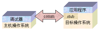综上所述,这一方案需要目标操作系统提供支持远程调试协议的通信模块(包括简单的设备驱动)和多任务调试接口,并改写异常处理的有关部分。另外目标操作系统还需要定义一个设置断点的函数;因为有的硬件平台提供能产生特定调试陷阱异常(debug trap)的断点指令以支持调试(如X86的INT 3),而另一些机器没有类似的指令,就用任意一条不能被解释执行的非法(保留)指令代替。目标操作系统添加的这些模块统称为"插桩"(见下图),驻留于ROM中则称为ROM monitor。通用操作系统也有具备这类模块的:编译运行于Alpha、Sparc或PowerPC平台的LINUX内核时若将kgdb开关打开,就相当于加入了插桩。