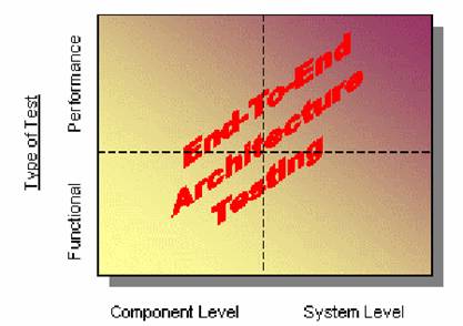 在评估性能和可伸缩性方面,这些并行分析模式能够帮助您发现系统架构的优势和缺陷,并在解决与性能和可伸缩性有关的问题时确定必须检查哪些组件。与此类似的功能测试策略(即全部数据完整性验证),正显得越来越关键,因为现在数据可能是从分散的数据源派生而来。通过评估组件内外的数据完整性(包括处理过程中的任何功能性的数据转换),测试人员可以定位每个潜在的错误,并使系统集成和缺陷隔离成为标准的开发过程的一部分。端到端架构测试(End to End Architecture Testing)指的是这样一种概念,它测试计算环境中所有的访问点,并在组件级和系统级的测试中将功能测试和性能测试整合在一起(见图2)。