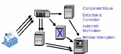 一旦应用环境开始工作并进行了性能优化,可以在 75%到 90%的环境利用率下进行一项长期可靠性测试(reliability testing),用来发现任何与较长的运行时间有关的问题。在应用了冗余和负载平衡的环境中,失败转移测试(failover testing)(图 7)分析理论上的失败过程并测试和测量总体失败转移进程及其对终端用户的影响。本质上,失败转移测试回答了这样一个问题:"如果一个特定的组件运行失败,用户还可不可以在最小的中断下继续进行访问和处理?"