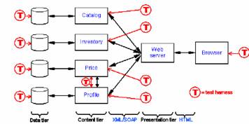 对上述的系统来说,一个端到端测试策略的起点是分别对内容层的每种服务同时应用功能测试和可伸缩性/负载测试。XML 请求被提交给每种内容服务,而相应的响应 XML 文档则被捕获,从而对它的数据内容或者响应时间进行评估。随着这些内容服务逐个的集成到系统中,通过向 Web 服务器提交事务,功能测试和可伸缩性/负载测试也都可以在集成系统中进行。事务可以贯穿整个站点进行验证,不论是为功能测试(使用 SQL 查询)还是为可伸缩性/负载测试。